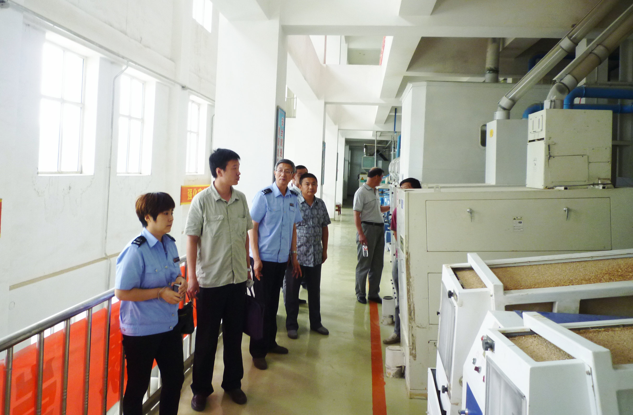 圖為黑龍江省安全生產(chǎn)監(jiān)督管理局職業(yè)健康安全檢查組與屬地牡丹江分局安全局及八五零農(nóng)場安全辦的相關(guān)人員在衛(wèi)星制米廠現(xiàn)場檢查指導(dǎo)。