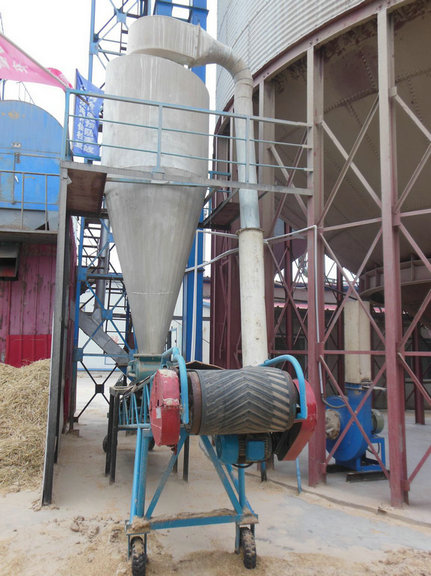 怎么解決這一問題呢?2014年10月以車間主任陳慶斌為首的烘干車間工人,積極出主意想辦法,根據(jù)他們多年的工作經(jīng)驗(yàn)和智慧,充分利用報廢設(shè)備上的舊風(fēng)機(jī)、關(guān)風(fēng)器、剎克龍、皮帶輪、主風(fēng)管零部件和廢舊角鐵、鐵板等邊角料等,自行研制了我們稱之為“水稻清理風(fēng)選機(jī)”,就是用風(fēng)選的方式把雜質(zhì)清理出來,作為圓筒清理(初清)篩的附加清選設(shè)備,同時還自制了4米水稻雜質(zhì)皮帶輸送清理機(jī)和10米風(fēng)管。