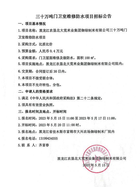 黑龍江農(nóng)墾北大荒米業(yè)集團(tuán)御綠制米有限公司三十萬(wàn)噸門(mén)衛(wèi)室維修防水項(xiàng)目招標(biāo)公告