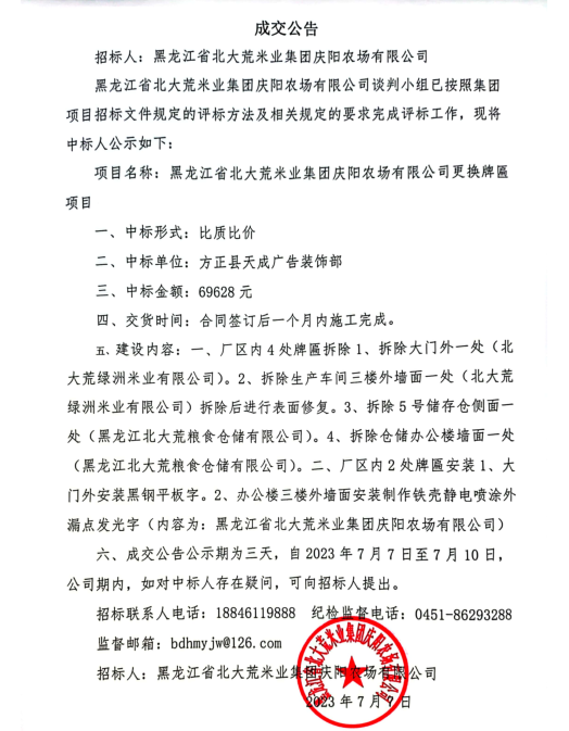 黑龍江省北大荒米業(yè)集團慶陽農(nóng)場有限公司更換牌匾項目成交公告