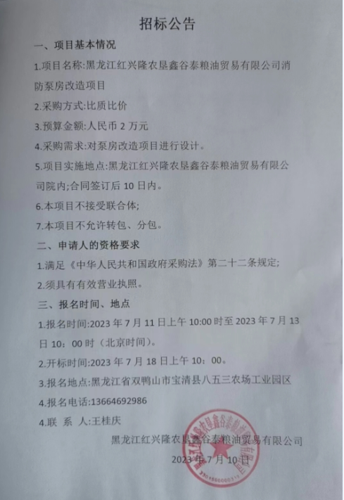 黑龍江紅興隆農(nóng)墾鑫谷泰糧油貿(mào)易有限公司消防泵房改造項目招標公告