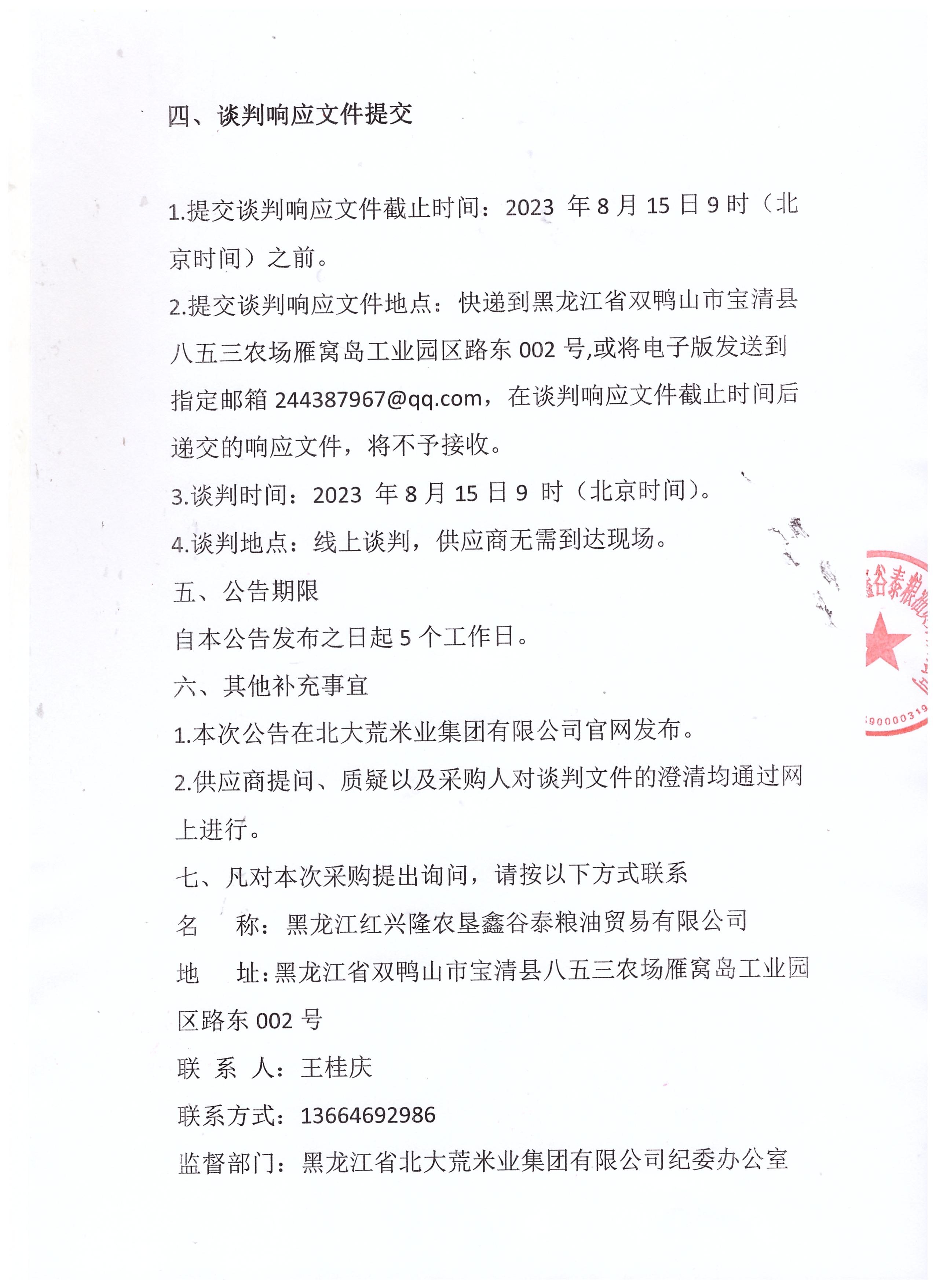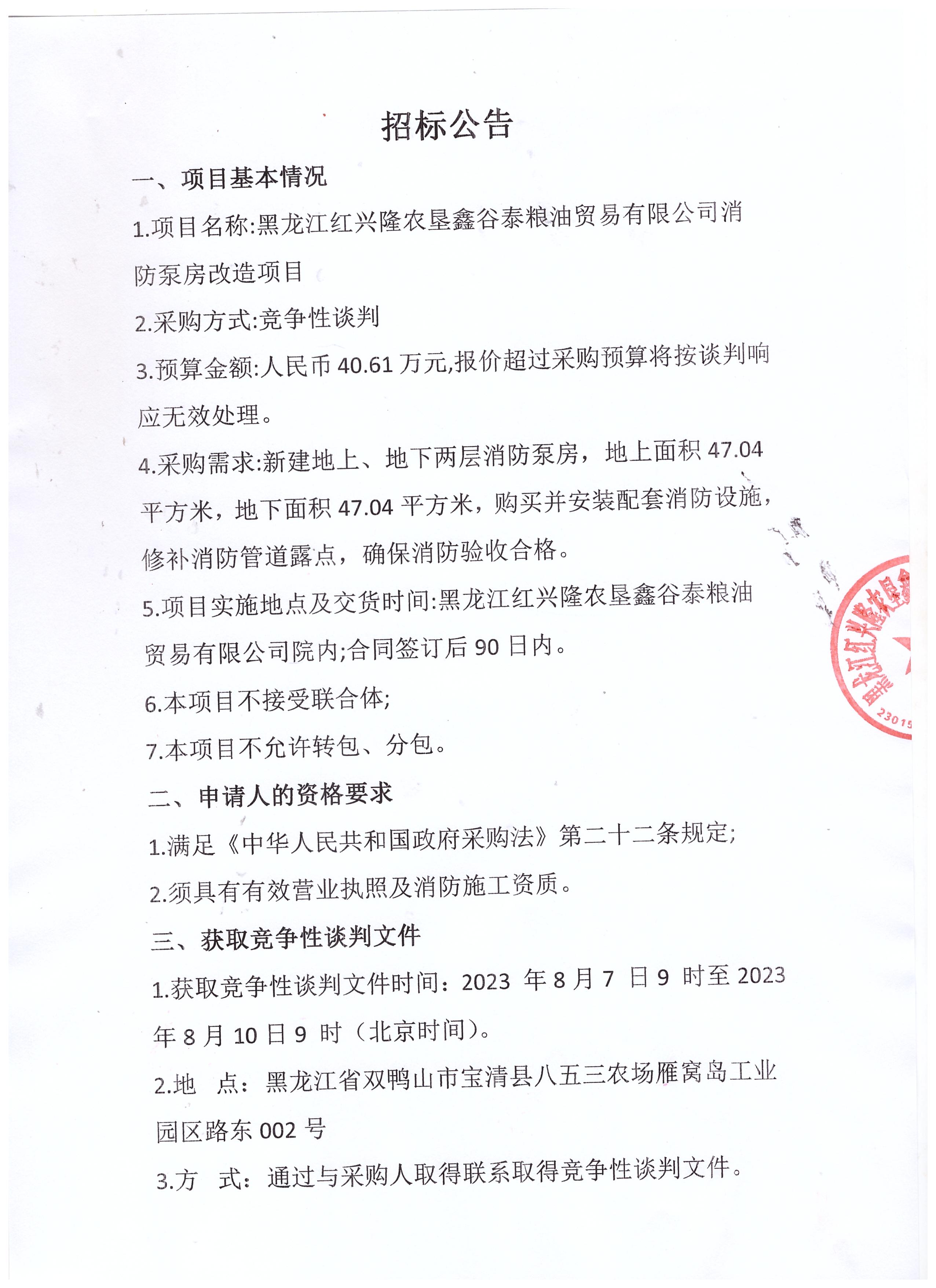 黑龍江紅興隆農墾鑫谷泰糧油貿易有限公司消防泵房改造項目招標公告