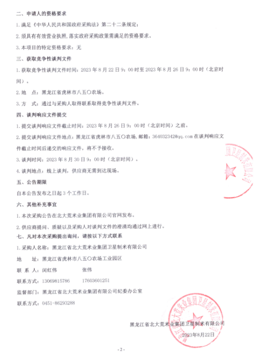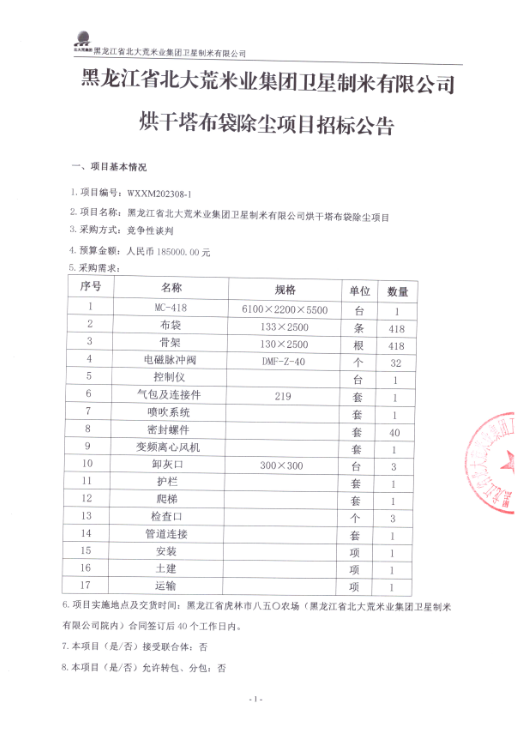 黑龍江省北大荒米業(yè)集團衛(wèi)星制米有限公司烘干塔布袋除塵項目招標公告