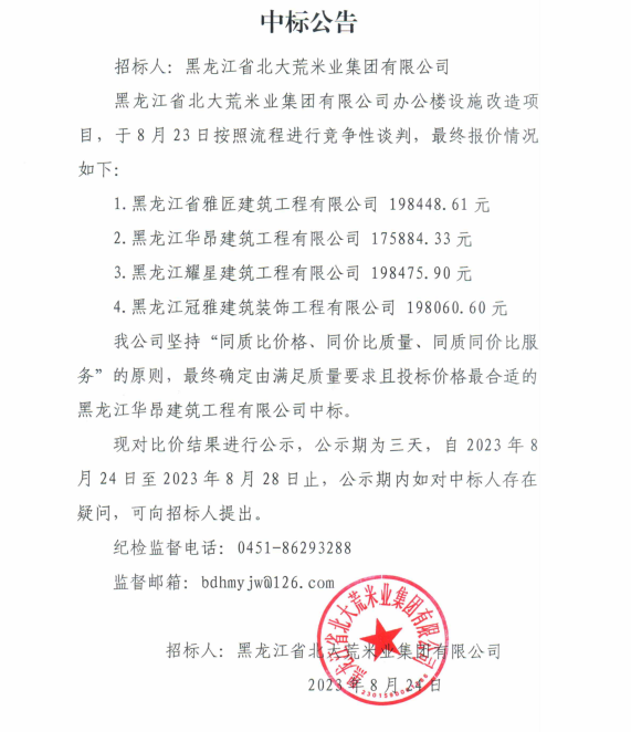黑龍江省北大荒米業(yè)集團(tuán)有限公司辦公樓設(shè)施改造項(xiàng)目中標(biāo)公告