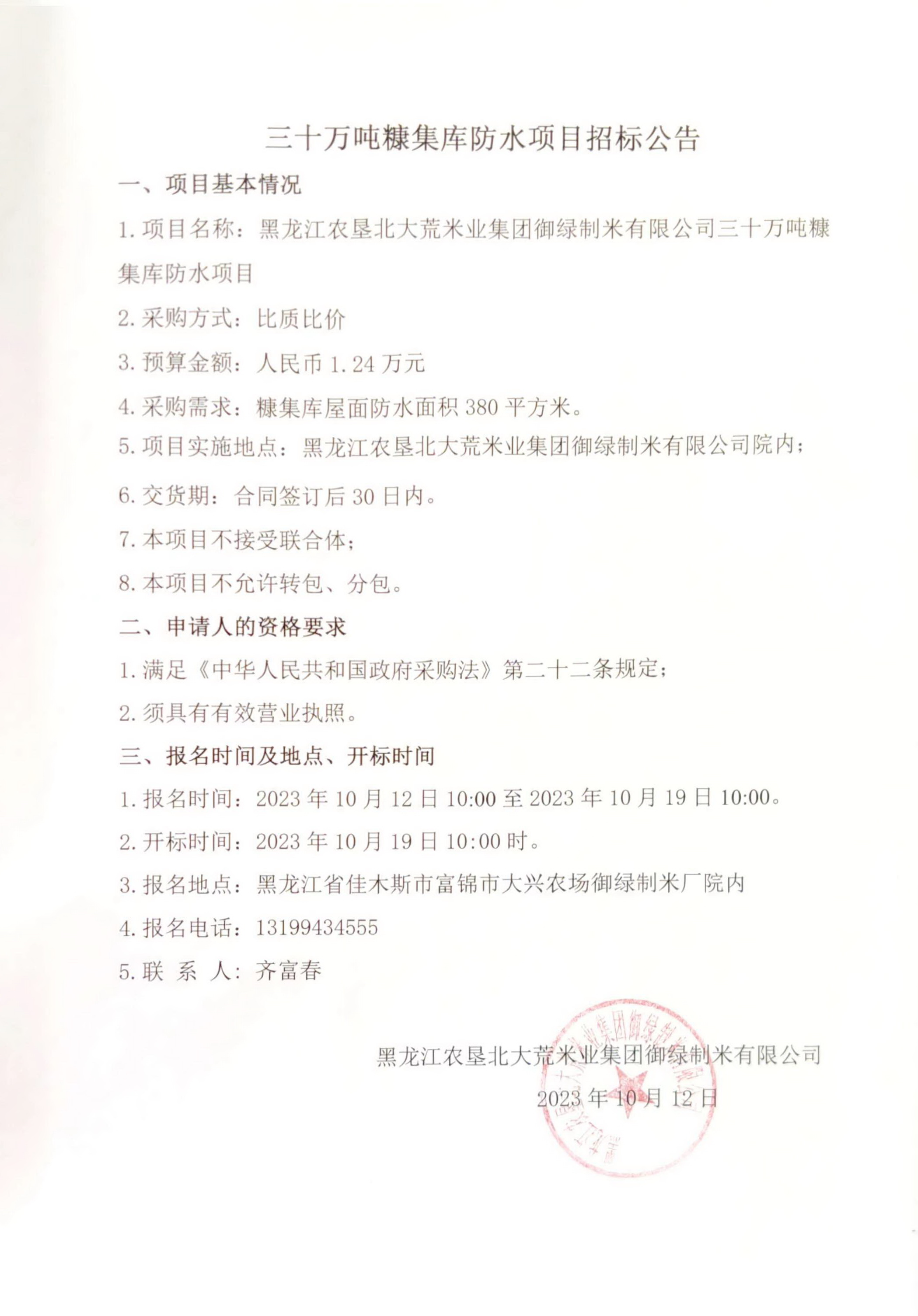 黑龍江農(nóng)墾北大荒米業(yè)集團(tuán)御綠制米有限公司三十萬(wàn)噸糠集庫(kù)防水項(xiàng)目招標(biāo)公告