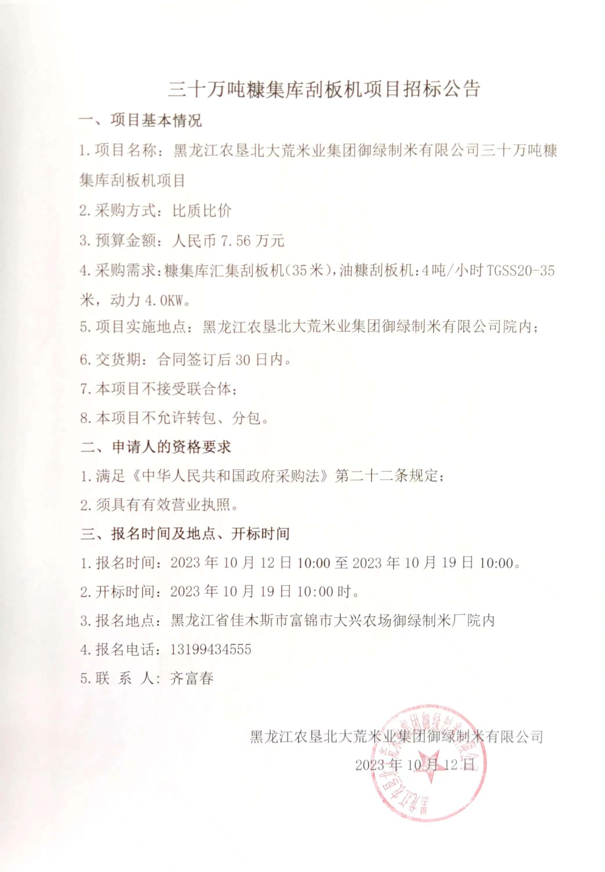 黑龍江農(nóng)墾北大荒集團(tuán)御綠制米有限公司三十萬(wàn)噸糠集庫(kù)刮板機(jī)項(xiàng)目招標(biāo)公告