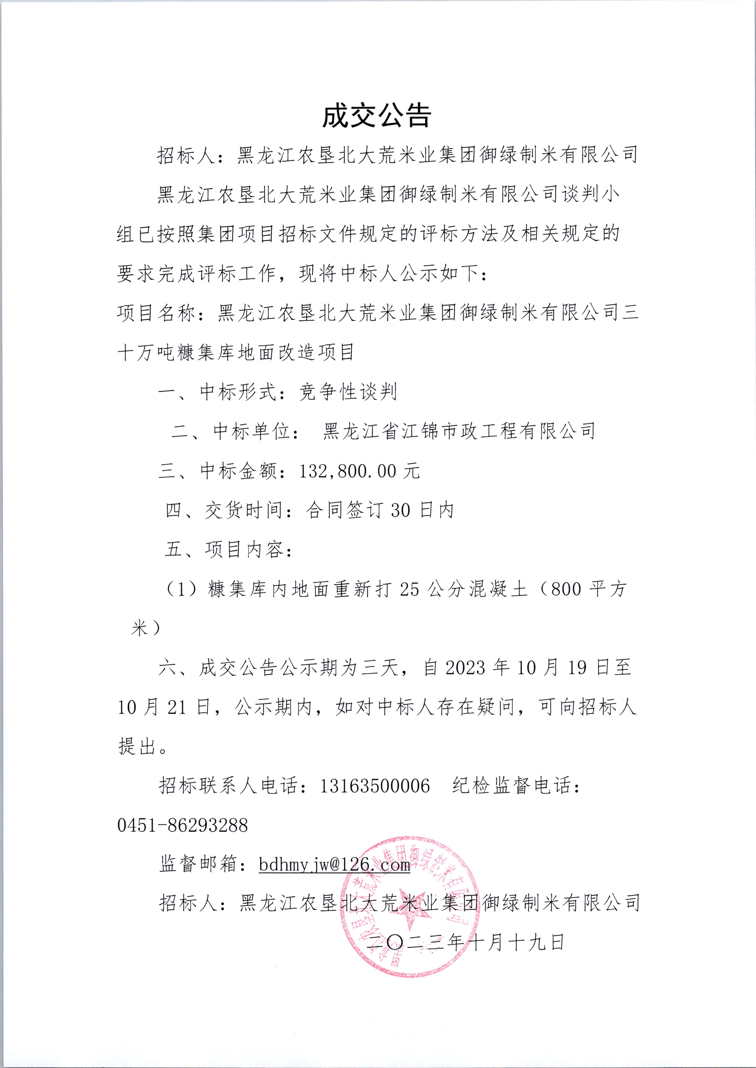 黑龍江農(nóng)墾北大荒集團(tuán)御綠制米有限公司三十萬(wàn)噸糠集庫(kù)地面改造項(xiàng)目成交公告