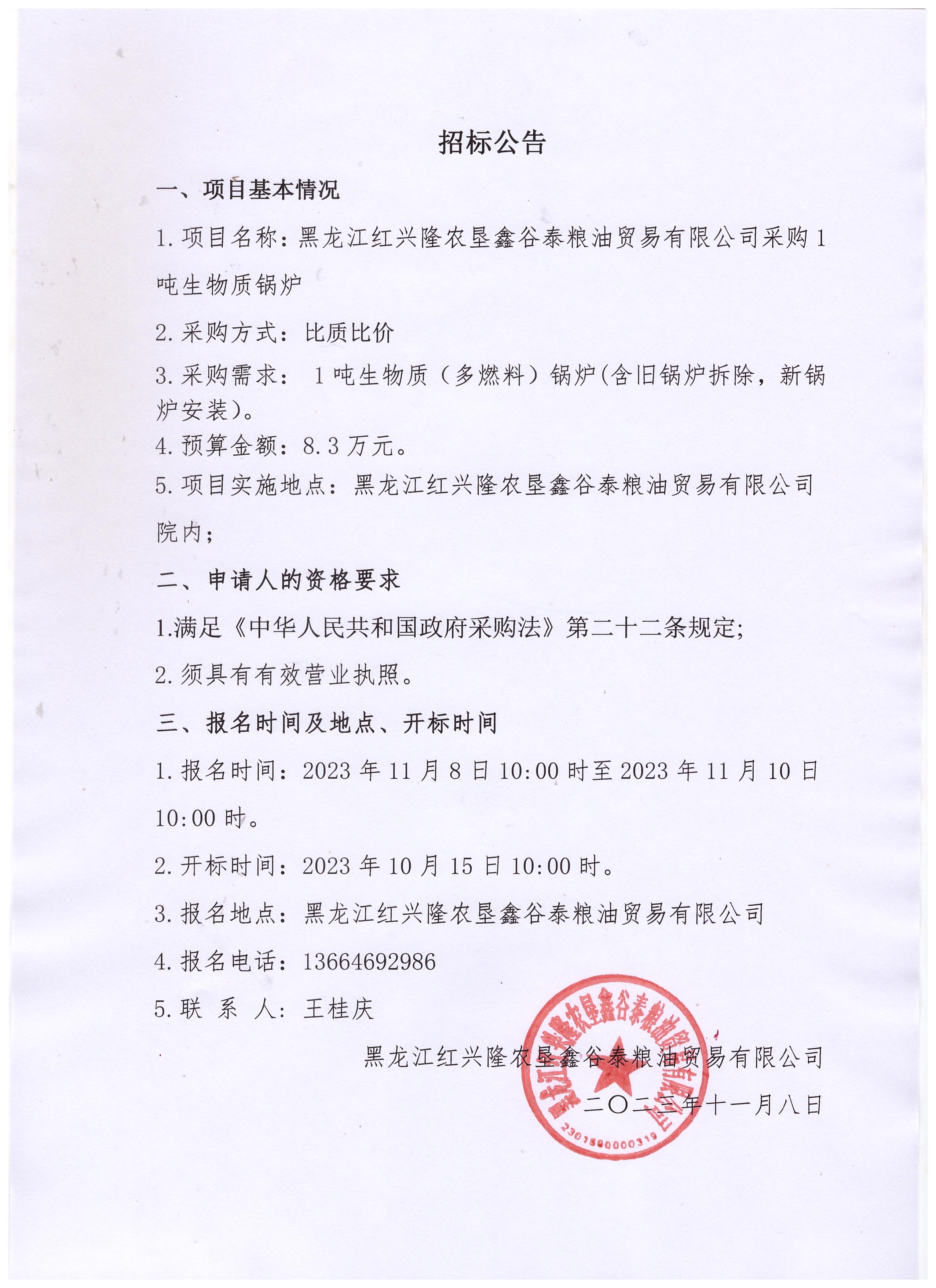 黑龍江紅興隆農(nóng)墾鑫谷泰糧油貿(mào)易有限公司采購1噸生物質(zhì)鍋爐招標公告