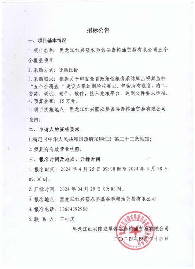 黑龍江紅興隆農(nóng)墾鑫谷泰公司五個全覆蓋項目招標(biāo)公告