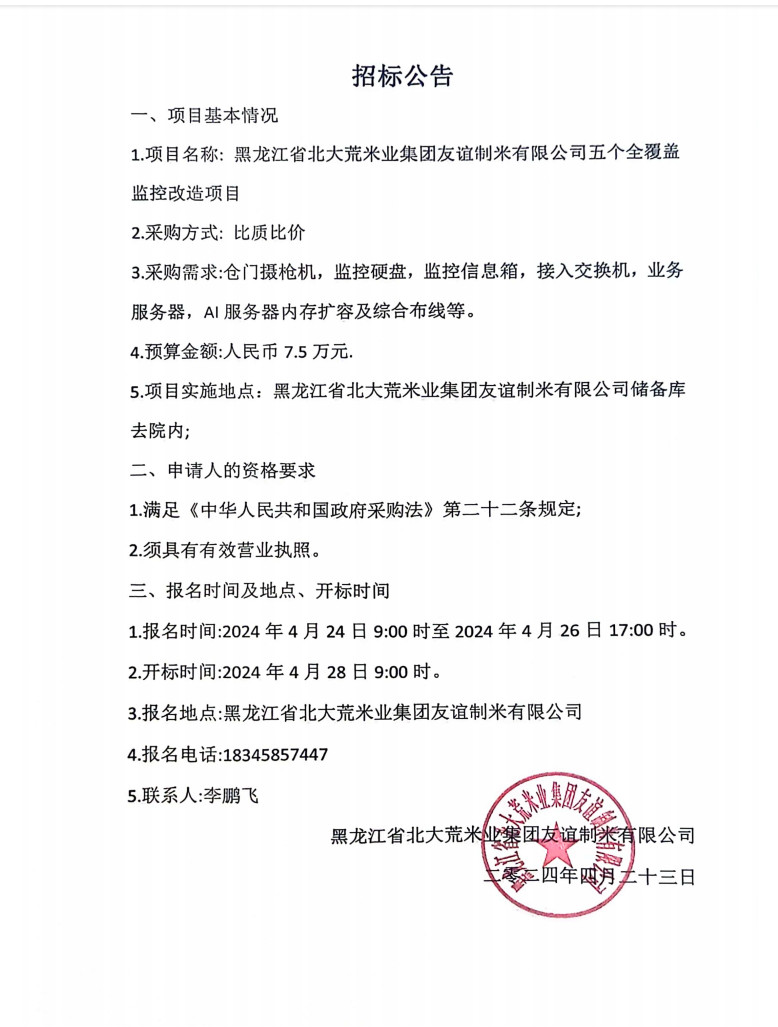 北大荒米業(yè)友誼公司五個(gè)全覆蓋監(jiān)控改造項(xiàng)目招標(biāo)公告