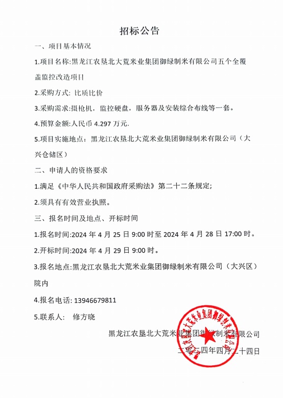 北大荒米業(yè)御綠公司五個全覆蓋監(jiān)控改造項目招標公告