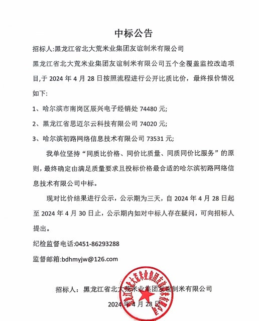 北大荒米業(yè)友誼公司五個(gè)全覆蓋監(jiān)控改造項(xiàng)目中標(biāo)公告