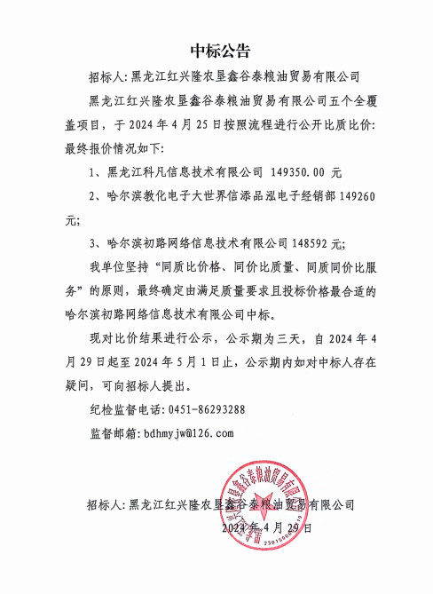 黑龍江紅興隆農(nóng)墾鑫谷泰公司五個全覆蓋項目中標(biāo)公告