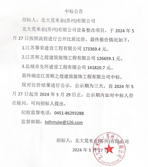 北大荒米業(yè)(蘇州)有限公司設(shè)備整改項(xiàng)目中標(biāo)公告