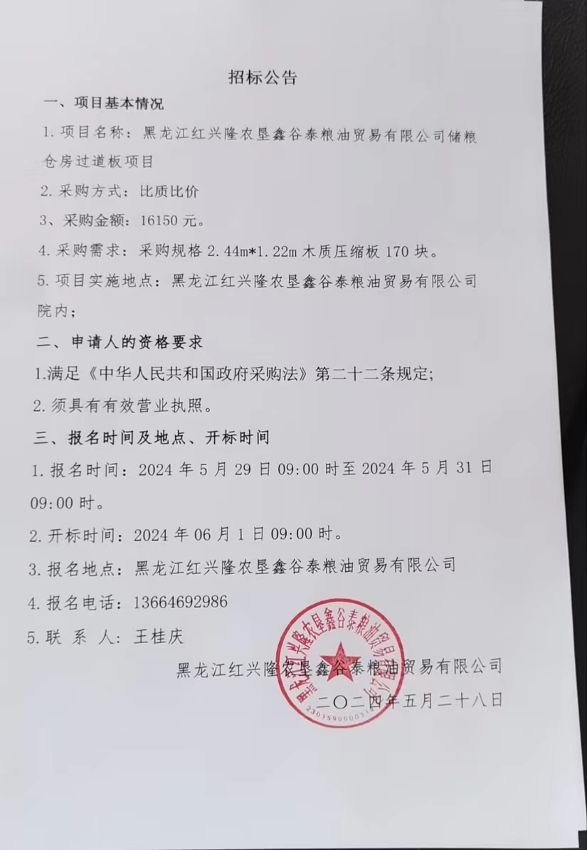 黑龍江紅興隆農(nóng)墾鑫谷泰糧油貿(mào)易有限公司糧儲(chǔ)倉房過道板項(xiàng)目招標(biāo)公告