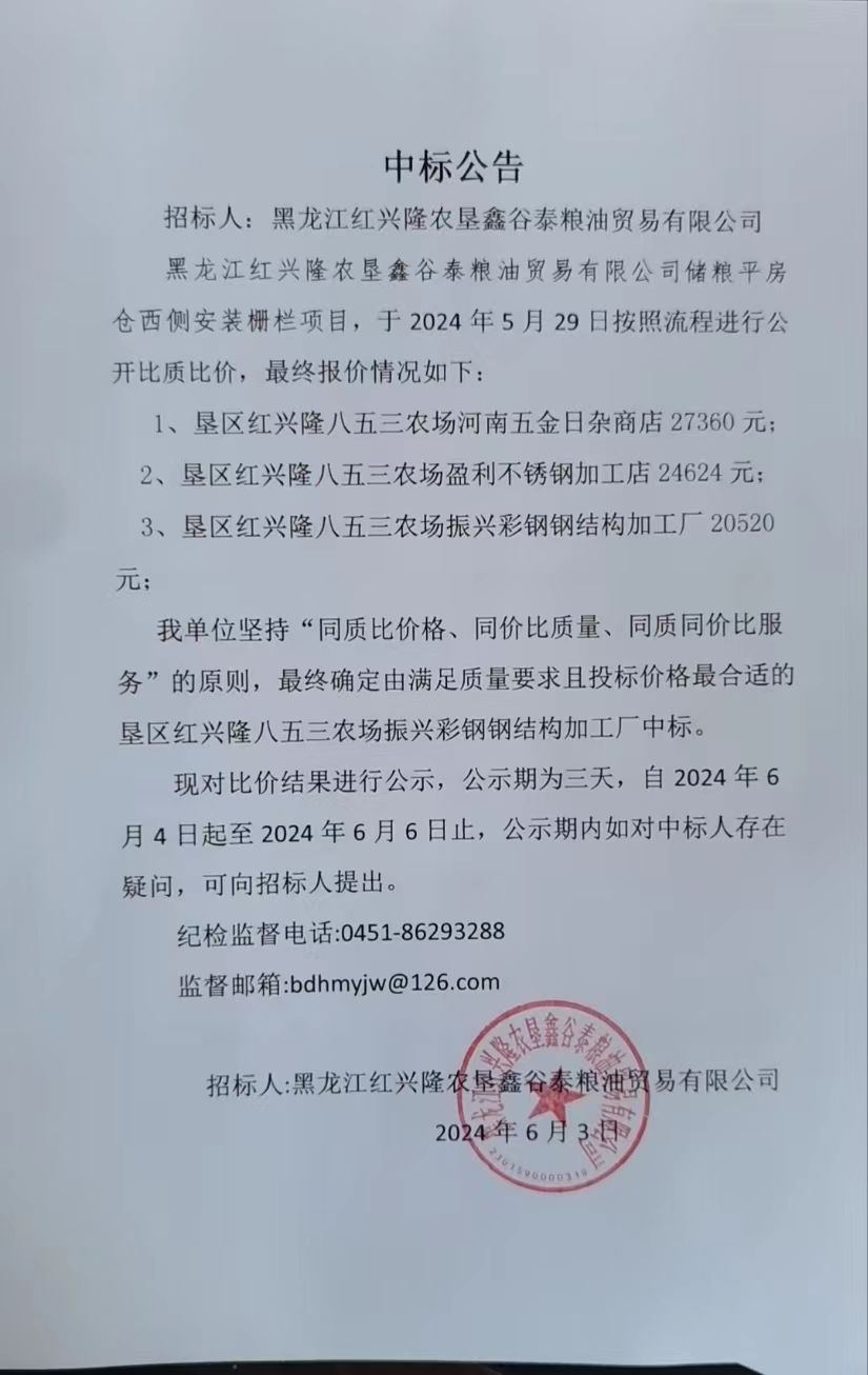 黑龍江紅興隆農(nóng)墾鑫谷泰糧油貿(mào)易有限公司平房倉(cāng)西側(cè)安裝欄柵項(xiàng)目中標(biāo)公告