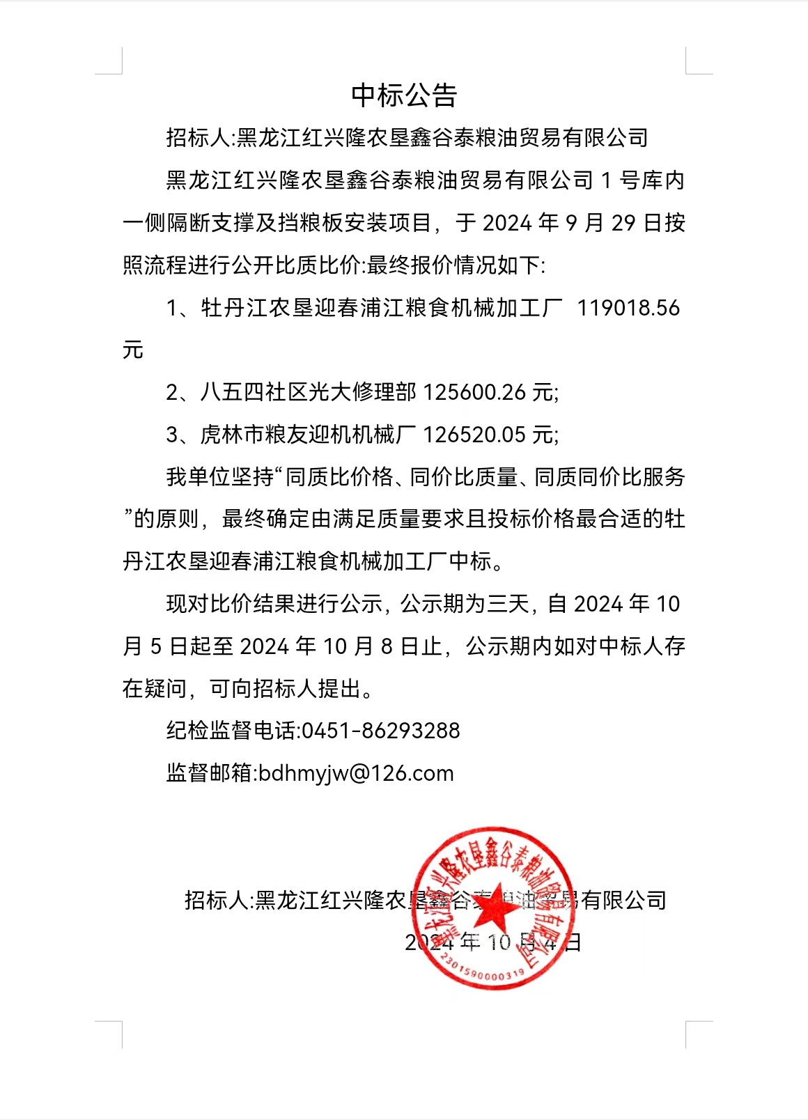 鑫谷泰糧油公司1號(hào)庫隔斷支撐及擋糧板項(xiàng)目中標(biāo)公告