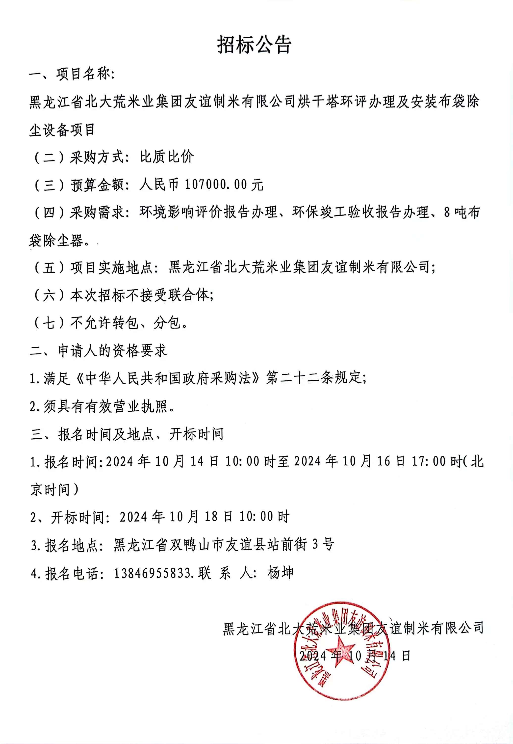 黑龍江省北大荒米業(yè)集團友誼制米有限公司烘干塔環(huán)評辦理及安裝布袋除塵設備項目招標公告