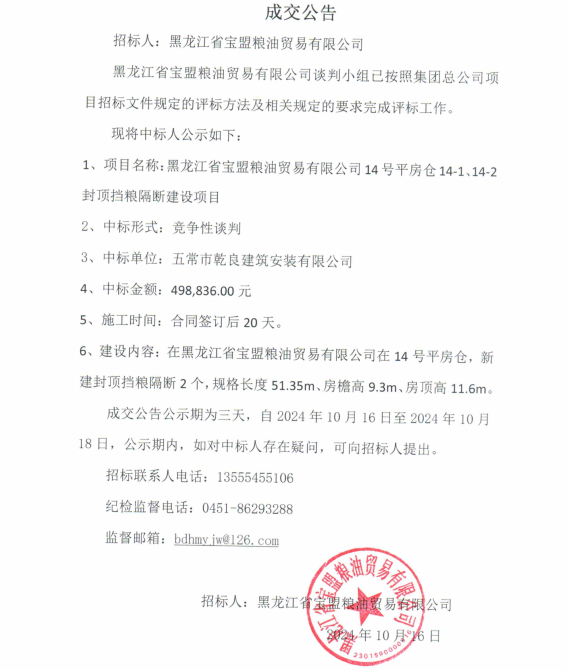 寶盟糧油貿(mào)易有限公司擋糧隔斷建設(shè)項目中標(biāo)公告
