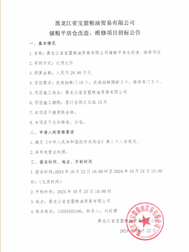 寶盟糧油貿(mào)易有限公司儲(chǔ)糧平房倉(cāng)改造、維修項(xiàng)目招標(biāo)公告