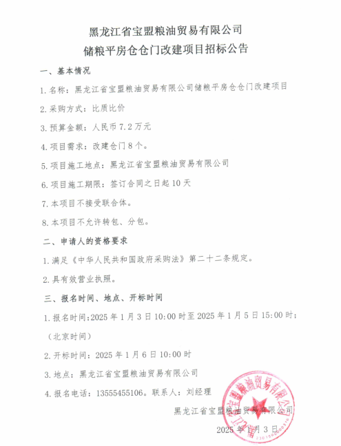 黑龍江省寶盟糧油貿(mào)易有限公司儲糧平房倉倉門改建項(xiàng)目招標(biāo)公告