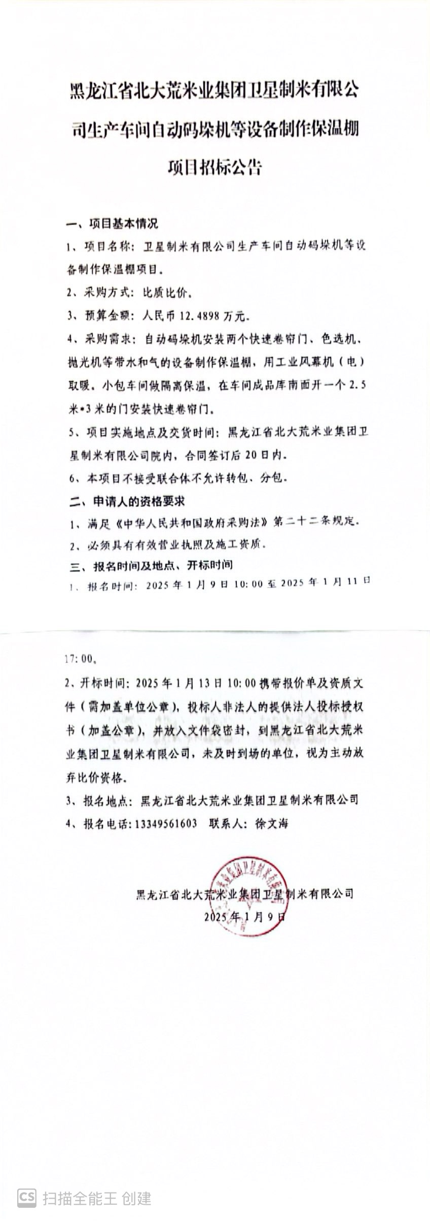 黑龍江省北大荒米業(yè)集團(tuán)衛(wèi)星制米有限公司生產(chǎn)車間自動碼垛機(jī)等設(shè)備制作保溫棚項(xiàng)目招標(biāo)公告