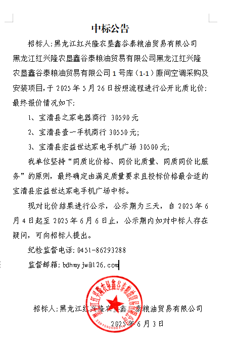 黑龍江紅興隆農(nóng)墾鑫谷泰糧油貿(mào)易有限公司1號(hào)庫(kù)空調(diào)采購(gòu)及安裝項(xiàng)目中標(biāo)公告