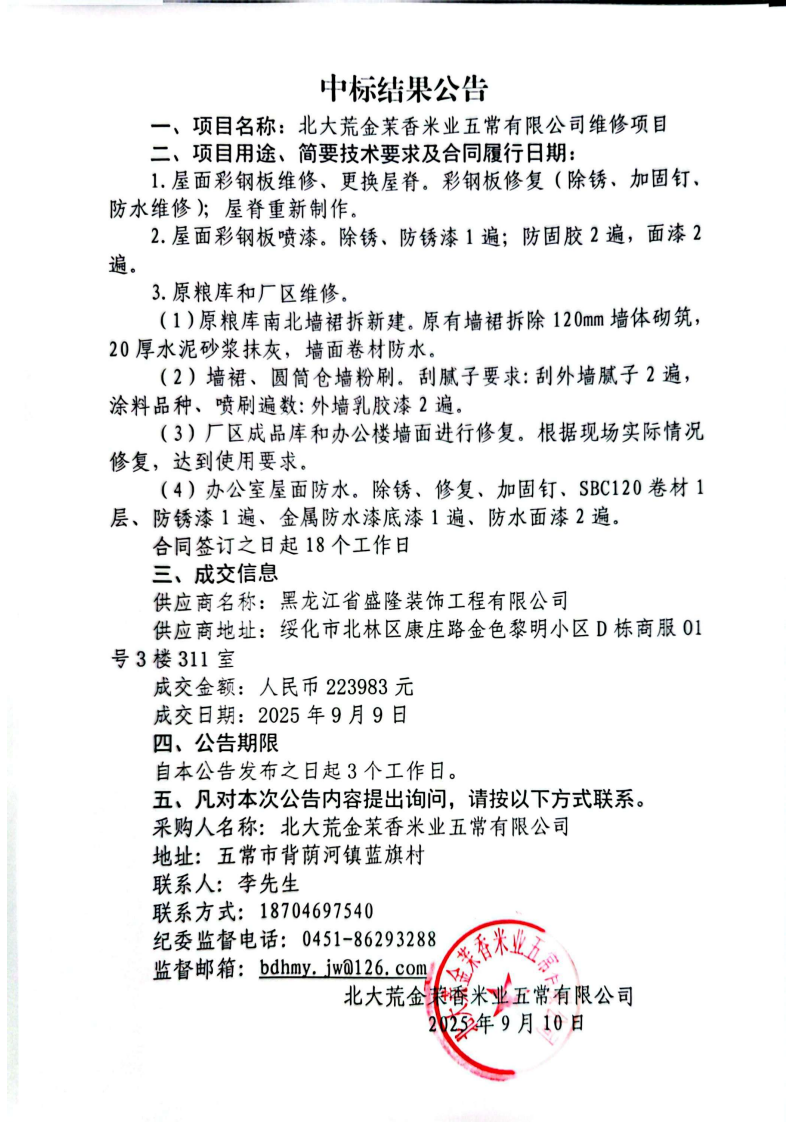 北大荒金茉香米業(yè)五常有限公司維修項目中標公告