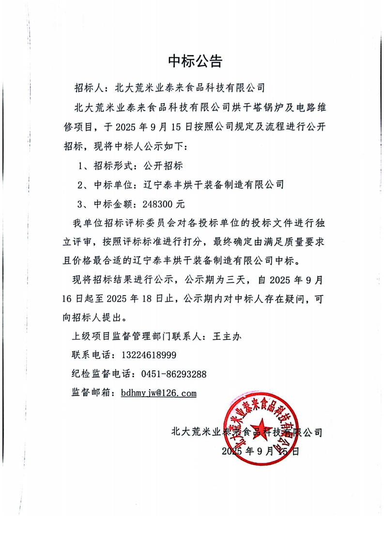 北大荒米業(yè)泰來食品科技有限公司烘干塔鍋爐及電路維修項(xiàng)目中標(biāo)公告
