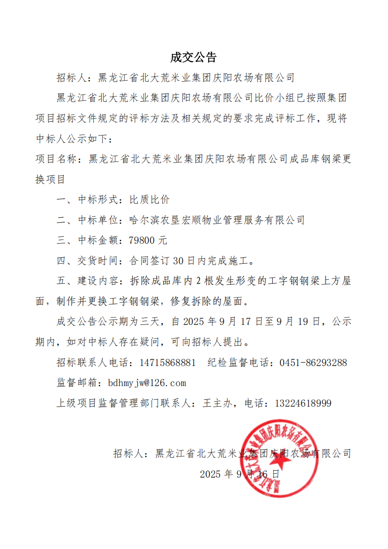北大荒米業(yè)集團(tuán)慶陽(yáng)農(nóng)場(chǎng)有限公司成品庫(kù)鋼梁更換項(xiàng)目中標(biāo)公告