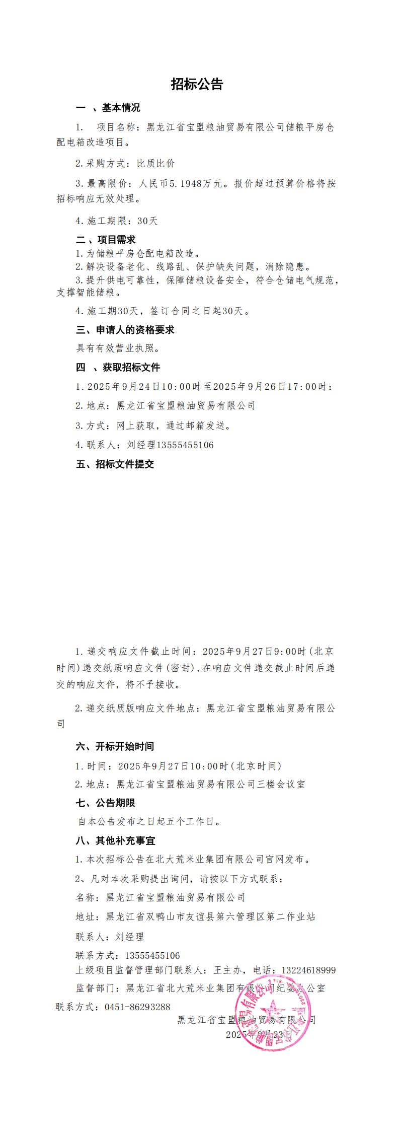 黑龍江省寶盟糧油貿(mào)易有限公司儲糧平房倉配電箱改造項目招標公告