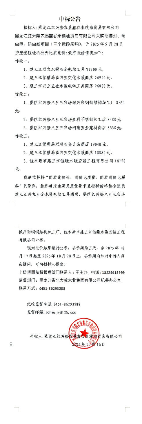 鑫谷泰糧油貿(mào)易有限公司采購防爆燈、防蟲網(wǎng)、防蟲線項目(三個標段采購)成交公告