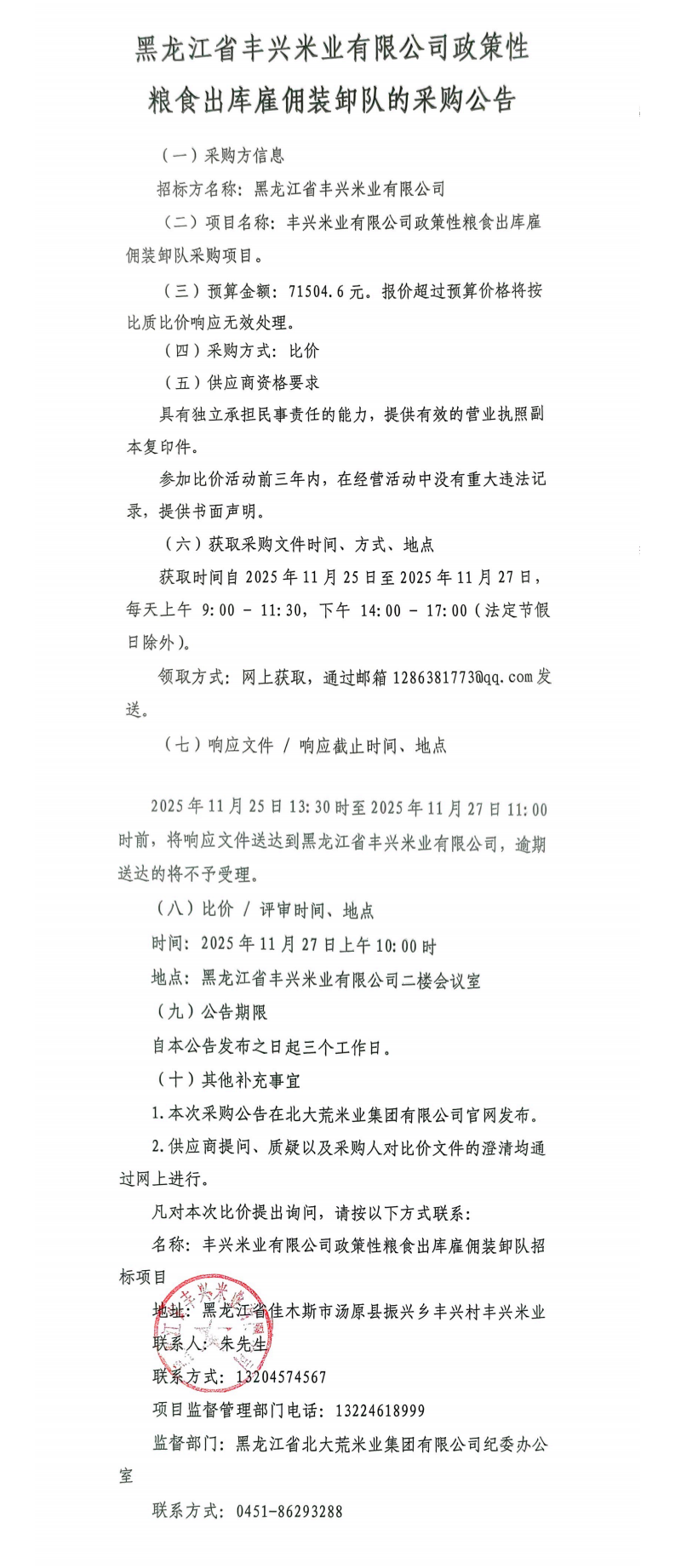 豐興米業(yè)政策性糧食出庫雇傭裝卸隊采購公告